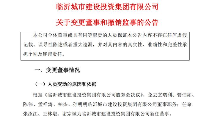 此外,临沂城投在公告中还表示,根据《中华人民共和国公司法》以及国务院国资委、山东省国资委、临沂市国资委关于深化国有企业监事会改革工作有关要求,免去董文彬、鹿荣华、 李佳昕、张家从、叶超监事职务,公司不再设置监事职务,由董事会等机构行使相关职权。截至公告出具之日,工商变更登记工作已完成。