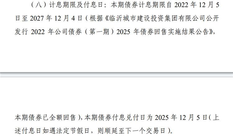 计息期限及付息日信息显示,该期债券计息期限自 2022 年 12 月 5日至 2027 年 12 月 4 日(根据《临沂城市建设投资集团有限公司公开发行 2022 年公司债券(第一期)2025 年债券回售实施结果公告》,本期债券已全额回售),本期债券付息兑付日为 2025 年 12 月 5 日。