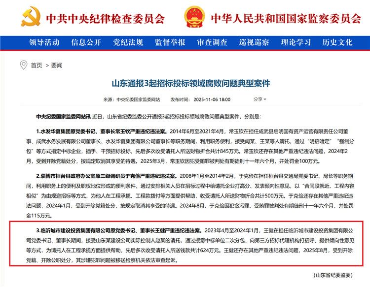 值得关注的是,2025年11月6日,山东省纪委监委公开通报3起招标投标领域腐败问题典型案件,其中涉及临沂城投原党委书记、董事长王健严重违纪违法案。