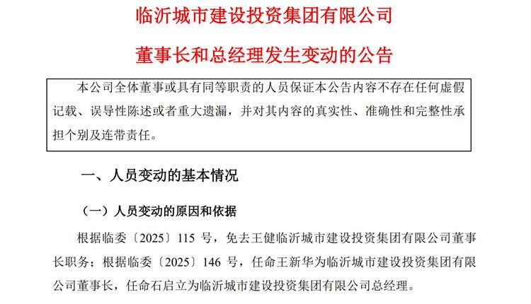 2025年11月10日,临沂城投发布公告,根据临委〔2025〕115 号,免去王健临沂城投董事长职务;根据临委〔2025〕146 号,任命王新华为临沂城投董事长,任命石启立为临沂城投总经理。