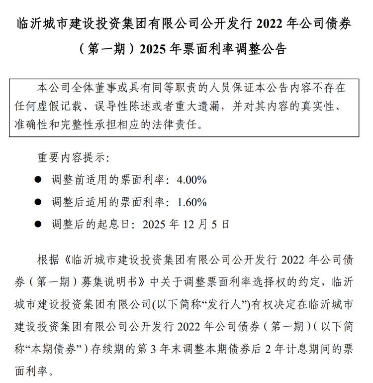 临沂城投在公告中称,根据《临沂城市建设投资集团有限公司公开发行 2022 年公司债券(第一期)募集说明书》中关于调整票面利率选择权的约定,临沂城投有权决定在该期债券存续期的第 3 年末调整本期债券后 2 年计息期间的票面利率。