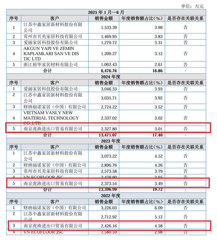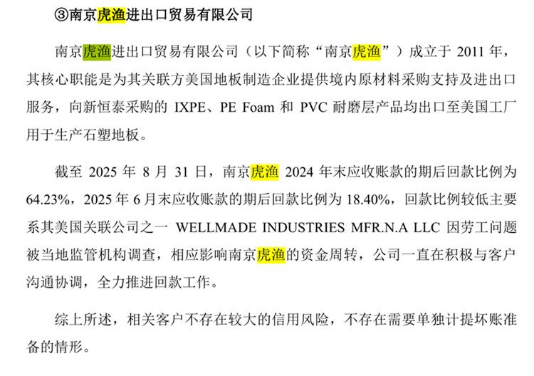 首轮问询回复显示,南京虎渔成立于2011年,其核心职能是为其关联方美国地板制造企业提供境内原材料采购支持及进出口服务,向新恒泰采购的 IXPE、PE Foam 和 PVC 耐磨层产品均出口至美国工厂用于生产石塑地板。截至 2025 年 8 月 31日,南京虎渔 2024年末应收账款的期后回款比例为 64.23%,2025年 6月末应收账款的期后回款比例为18.40%,回款比例较低主要系其美国关联公司之一 WELLMADE INDUSTRIES MFR.N.A LLC 因劳工问题被当地监管机构调查,相应影响南京虎渔的资金周转。