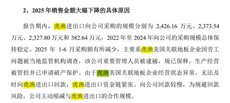 二轮问询回复显示,虎渔美国关联地板企业因劳工问题被当地监管机构调查,该公司重要管理人员被逮捕,现已保释,生产经营被管控并已申请破产保护。由于虎渔美国关联地板企业经营状态异常、无法及时向南京虎渔回款,南京虎渔资金链紧张、向公司回款较慢,为规避回款风险,公司主动缩减与南京虎渔的合作规模。