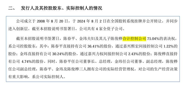 截至招股说明书签署日,陈春平、金玮夫妇及其儿子陈俊桦合计控制公司75.04%的表决权,系新恒泰控股股东,其中:陈春平直接持有公司 36.41%的股份,通过嘉兴熙宏间接控制公司 1.22%的股份;金玮直接持有公司30.24%的股份,通过嘉兴力权间接控制公司2.43%的股份;陈俊桦直接持有公司4.74%的股份。
