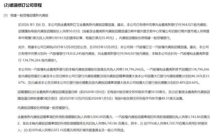 公告还披露,金义高新内资股认购事项的所得款项总额约为人民币30亿元,一汽股权内资股认购事项的所得款项总额约为人民币37.44亿元,本轮合计内资股认购事项的所得款项总额将共约为人民币67.44亿元,其中,其中约70%将用于研发投入。