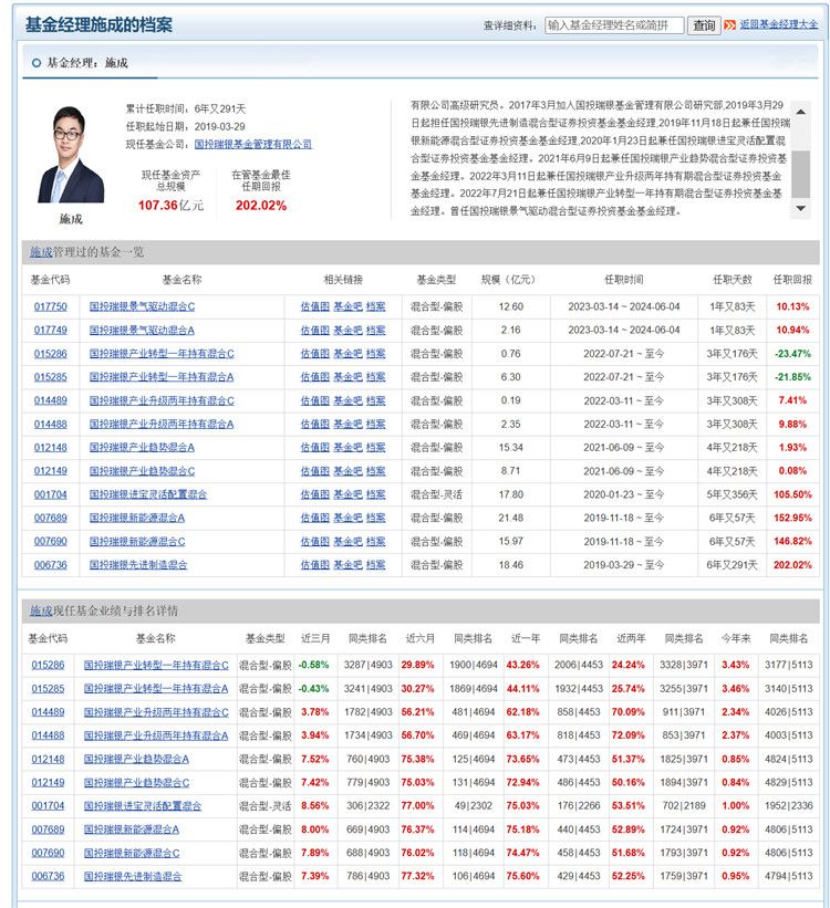 2017年3月,施成加入国投瑞银基金管理有限公司研究部,2019年3月29日起担任国投瑞银先进制造混合型证券投资基金基金经理,2019年11月18日起兼任国投瑞银新能源混合型证券投资基金基金经理,2020年1月23日起兼任国投瑞银进宝灵活配置混合型证券投资基金基金经理。2021年6月9日起兼任国投瑞银产业趋势混合型证券投资基金基金经理。2022年3月11日起兼任国投瑞银产业升级两年持有期混合型证券投资基金基金经理。2022年7月21日起兼任国投瑞银产业转型一年持有期混合型证券投资基金基金经理。曾任国投瑞银景气驱动混合型证券投资基金基金经理。天天基金网数据显示,施成在管基金产品规模约107亿元。
