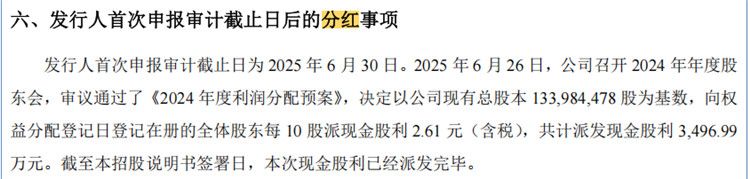 招股书显示,2025年6月26日,昌德科技召开2024年年度股东会,审议通过了《2024年度利润分配预案》,决定以公司现有总股本1.34亿股为基数,共计派发现金股利3496.99万元。