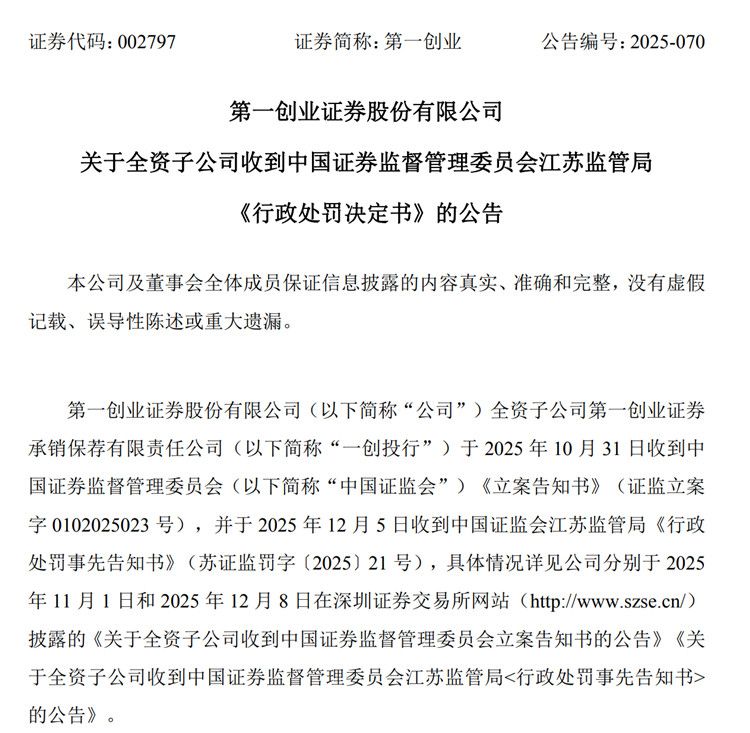 值得注意的是,第一创业发布公告称,2025年12月25日,一创投行收到中国证监会江苏监管局《行政处罚决定书》,经查明,一创投行在鸿达兴业 2019 年可转债项目持续督导期间未勤勉尽责,包括未充分核查募集资金投入及归还情况;未按规定发表核查意见,导致出具的相关持续督导文件存在虚假记载;未按规定履行督促及报告义务。