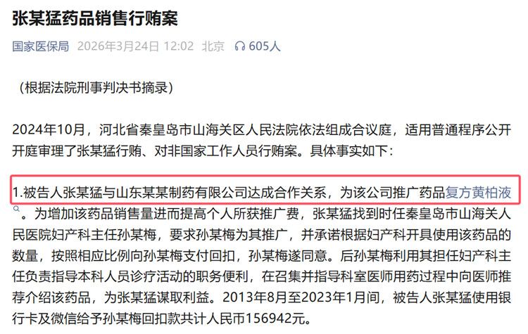 3月24日,国家医保局官方微信公众号发布张某猛药品销售行贿案相关通报,具体内容根据法院刑事判决书摘录。通报显示,2013年8月至2023年7月,推广人员张某猛为提升复方黄柏液销量,向时任秦皇岛市山海关人民医院妇产科主任、门诊药房主任及两名皮肤科医生输送回扣与好处费合计36.5万元。