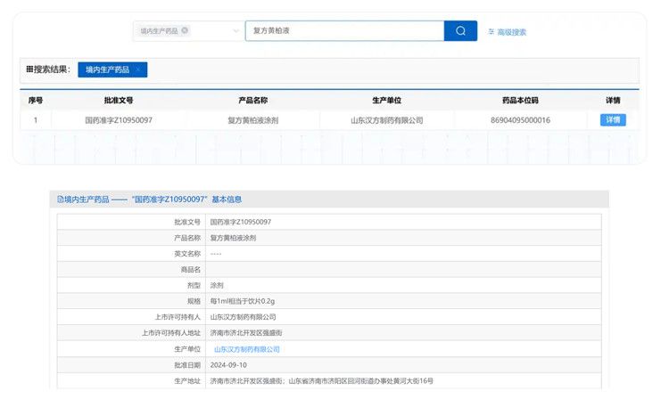 据界面新闻报道,在国家药监局查询发现,复方黄柏液为独家品种,上市许可持有人、生产单位均为山东汉方制药(下称“汉方制药”)。换而言之,国家医保局点名的“山东某某制药”即为汉方制药。
