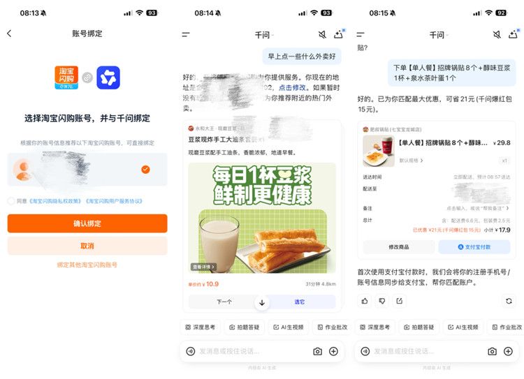 千问开始接入阿里旗下多个应用。1月15日,澎湃新闻记者实测发现,在千问APP中,用户通过授权绑定淘宝闪购账号后,能根据推荐选择下单。在出行方面,能通过跳转到飞猪APP进行预定机票操作。