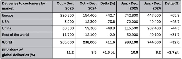 在欧洲市场,电动车型表现最为亮眼,2025年第四季度交付22.03万辆,同比激增42.7%;全年交付74.28万辆,增幅高达65.9%,成为集团增长的核心驱动力。