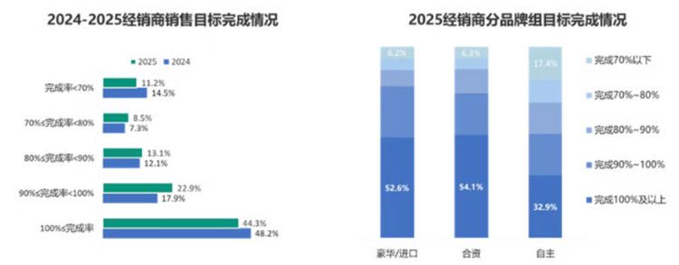 针对年度销量目标完成率,《调查报告》显示,2025年全年超过一半的经销商未能完成年度销量目标,仅44.3%的经销商完成了年度目标。销量目标完成情况不及2024年。
