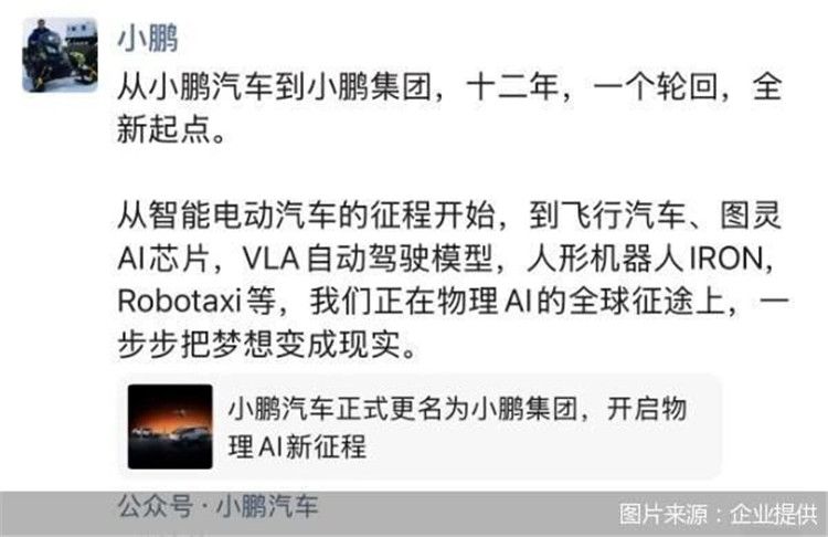 此番更名的背后,是小鹏汽车从整车企业向AI科技集团转型的野心。小鹏汽车董事长、CEO何小鹏在朋友圈写道:从小鹏汽车到小鹏集团,十二年,一个轮回,全新起点,“从智能电动汽车的征程开始,到飞行汽车、图灵AI芯片、VLA自动驾驶模型、人形机器人IRON、Robotaxi等,我们正在物理AI的全球征途上,把梦想变成现实”。
