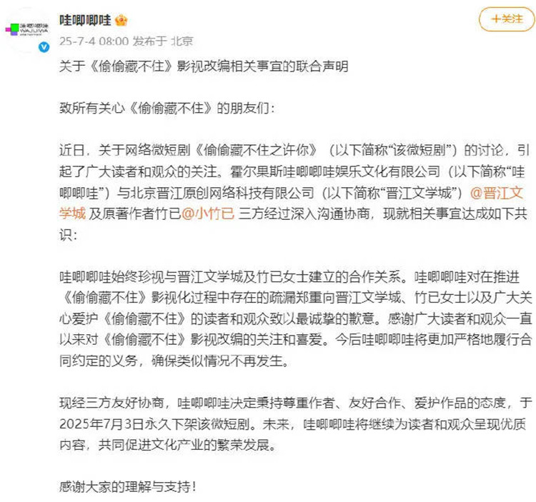 7月4日,哇唧唧哇发布关于《偷偷藏不住》影视改编相关事宜的联合声明:微短剧《偷偷藏不住》永久下架。