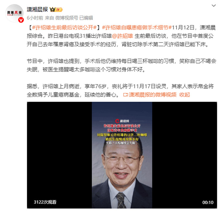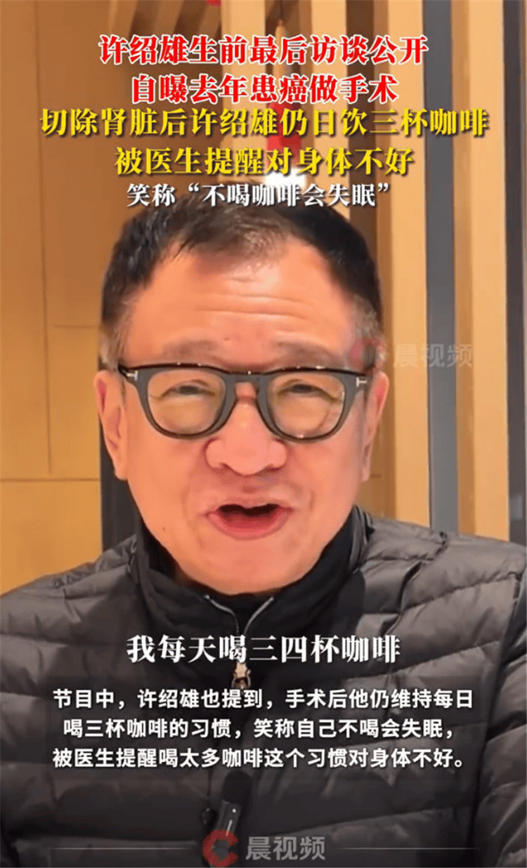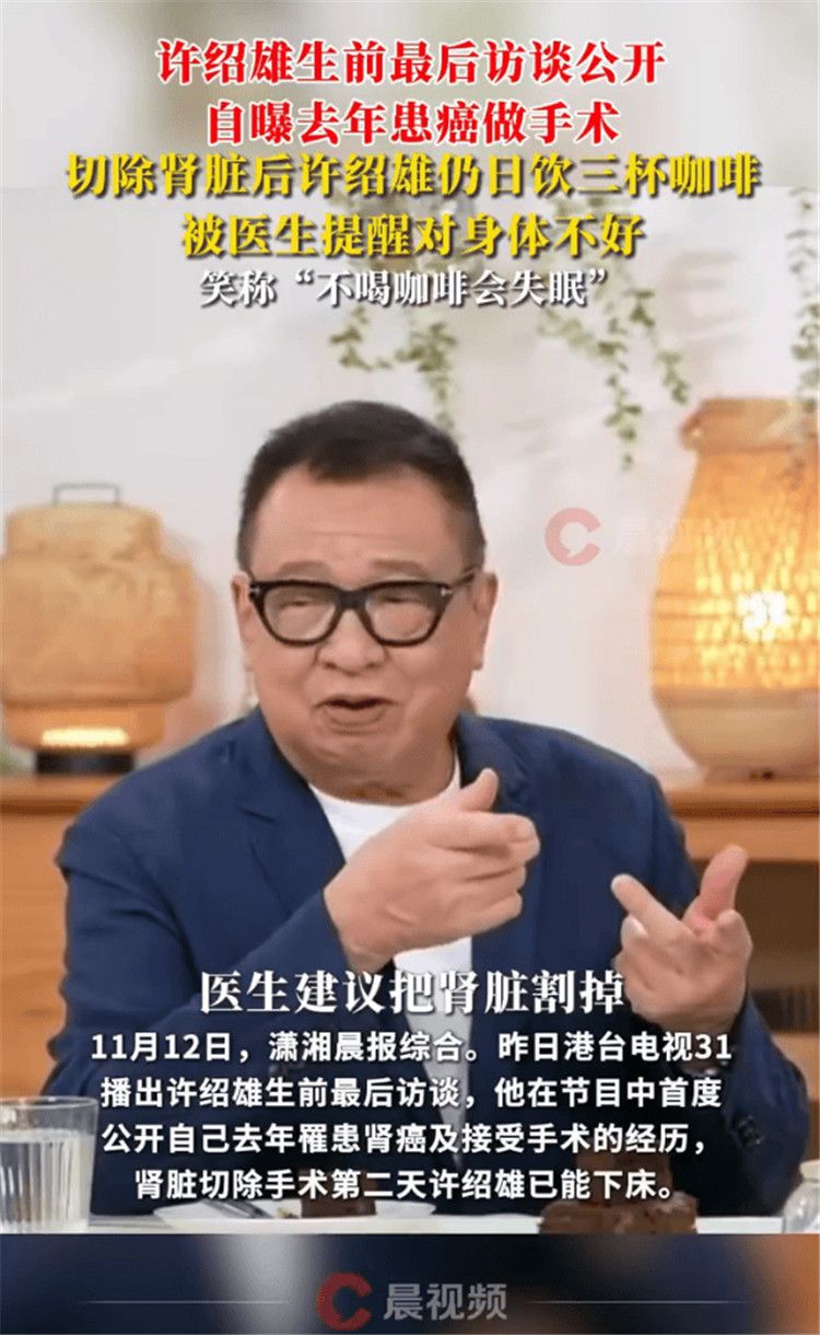 昨日港台电视31播出许绍雄生前最后访谈,他在节目中首度公开自己去年罹患肾癌及接受手术的经历,肾脏切除手术第二天许绍雄已能下床。节目中,许绍雄也提到,手术后他仍维持每日喝三杯咖啡的习惯,笑称自己不喝会失眠,被医生提醒喝太多咖啡这个习惯对身体不好。