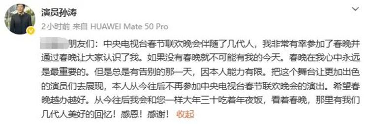 26日,孙涛在社交平台发文宣布退出央视春晚舞台。“春晚在我心中永远是最重要的。但是总是有告别的那一天,因本人能力有限。把这个舞台让更加出色的演员们去展现,本人从今往后不再参加中央电视台春节联欢晚会的演出。”