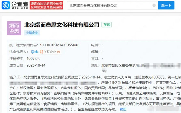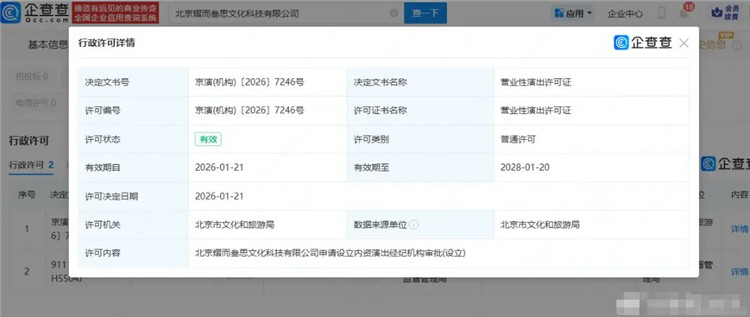 企查查APP显示,近日,北京熠而叁思文化科技有限公司取得营业性演出许可证,许可内容为该公司申请设立内资演出经纪机构审批,有效期自2026年1月21日至2028年1月20日。据此前报道,赵露思在生日会上宣布成立新工作室、加入新公司即北京熠而叁思文化科技有限公司。
