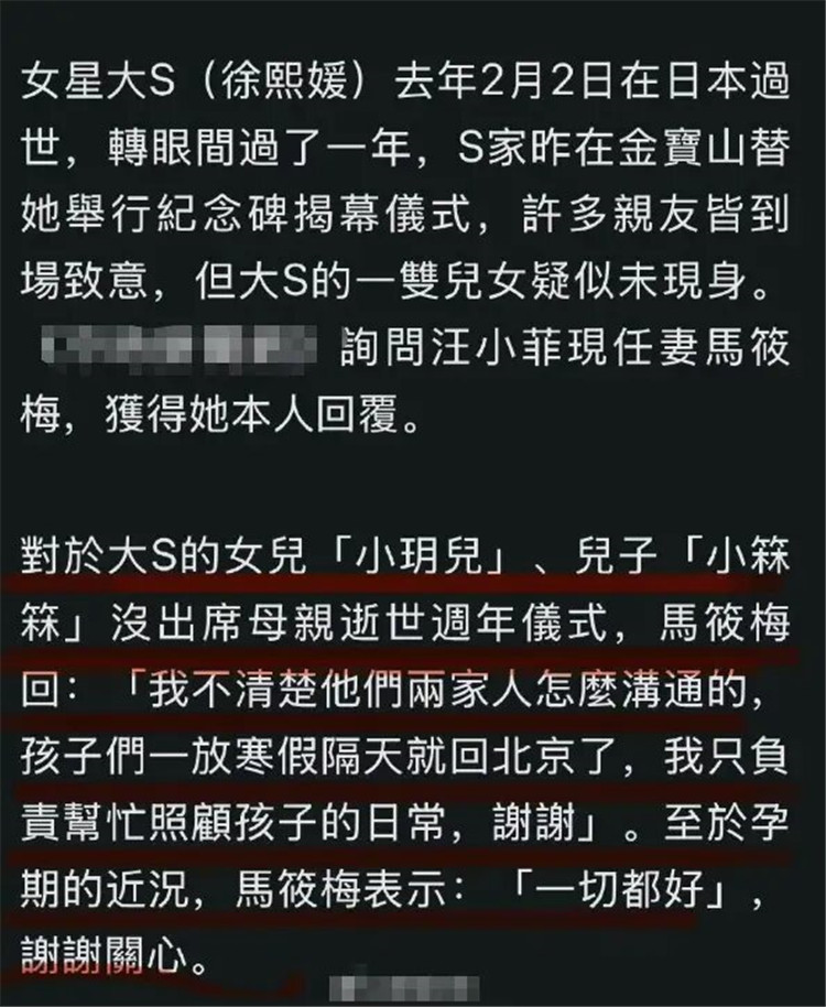 日前,马筱梅在社交平台回应大S儿女缺席大S雕像揭幕。马筱梅表示“我不清楚他们两家人怎么沟通的,孩子们一放寒假隔天就回北京了,我只负责帮忙照顾孩子的日常,谢谢。”
