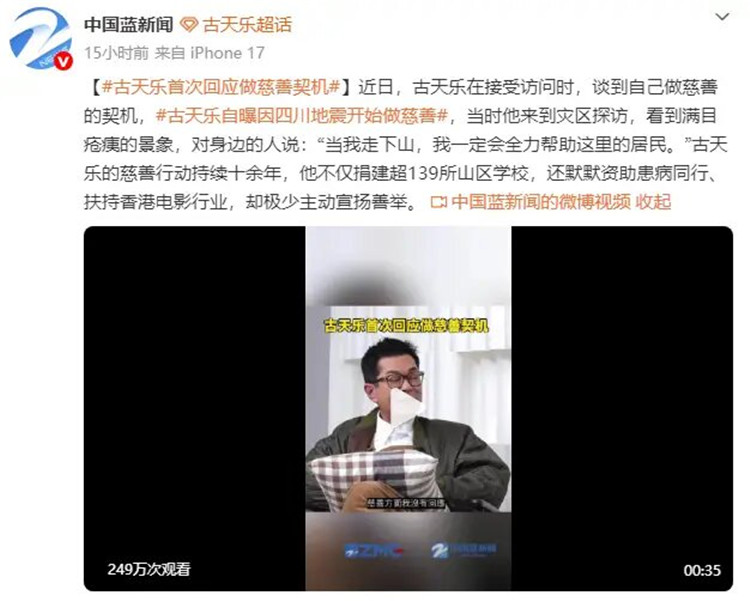 近日,古天乐在接受访问时,谈到自己做慈善的契机,自曝因四川地震开始做慈善,当时他来到灾区探访,看到满目疮痍的景象,对身边的人说:“当我走下山,我一定会全力帮助这里的居民。”古天乐的慈善行动持续十余年,他不仅捐建超139所山区学校,还默默资助患病同行、扶持香港电影行业,却极少主动宣扬善举。