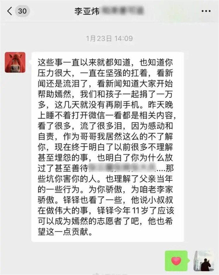 图中显示,李亚炜对李亚鹏说:“这些事一直以来就都知道,也知道你压力很大,一直在坚强的扛着,看新闻还是流泪了,看新闻知道大家开始帮助嫣然,我们和孩子一起捐了一万多,这几天就没有再刷手机。”“为你骄傲,为咱老李家骄傲。铎铎也看了一些,他说小叔叔在做伟大的事,铎铎今年11岁了应该可以成为嫣然的志愿者了吧,他也希望这一点贡献。”