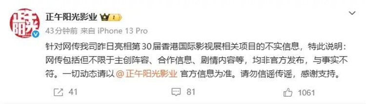 3月17日,正午阳光影业携作品亮相香港国际影视展,网传《小巷人家2》原班人马回归、以庄图南、李佳创业为主线等多部作品相关信息引热议。18日,正午阳光辟谣,称网传包括但不限于主创阵容、合作信息、剧情内容等,均非官方发布,与事实不符,以官方信息为准。