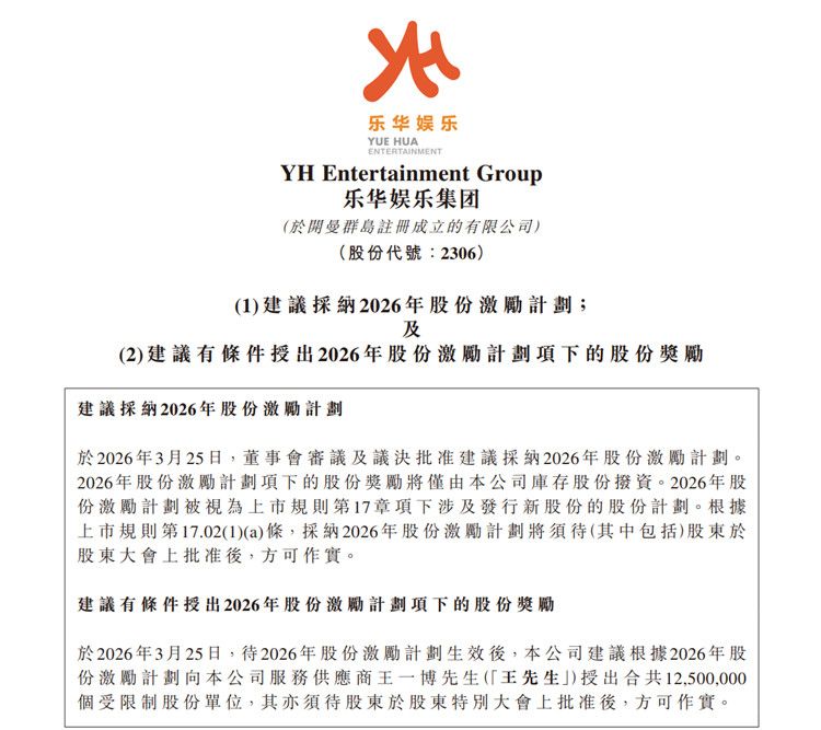 3月25日晚间,乐华娱乐公告,董事会审议并决议批准采纳2026年股份激励计划。同时,待2026年股份激励计划生效后,公司建议根据2026年股份激励计划向公司服务供应商王一博授出合共1250万个受限制股份单位,占公司已发行股份总数的约1.51%,认购价为每股0.01港元。