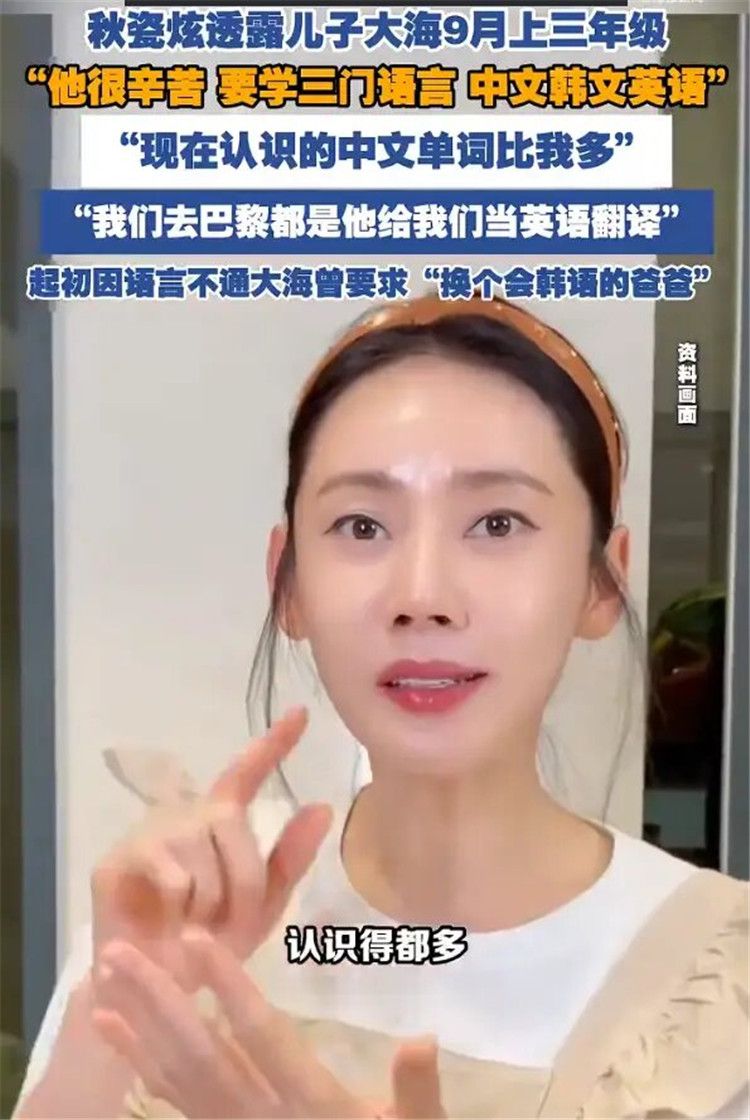 近日,韩国演员秋瓷炫在视频中透露,自己的儿子大海9月上三年级,“他很辛苦,要学三门语言,中文韩文英语”。秋瓷炫还透露,儿子大海现在认识的中文单词比自己多,去巴黎都是儿子给他们当英语翻译。起初因语言不通,大海还曾要求“换个会韩语的爸爸”。