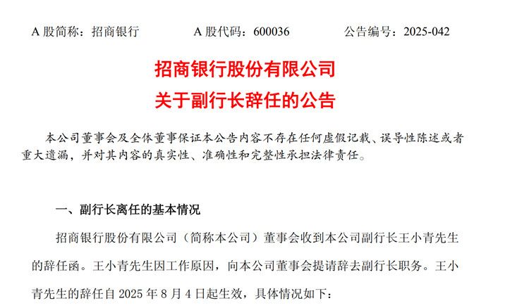 招商系金融版图正迎来新一轮调整,近期招商银行发布公告称,王小青因工作原因,向董事会提请辞去副行长职务,辞任于当天生效。