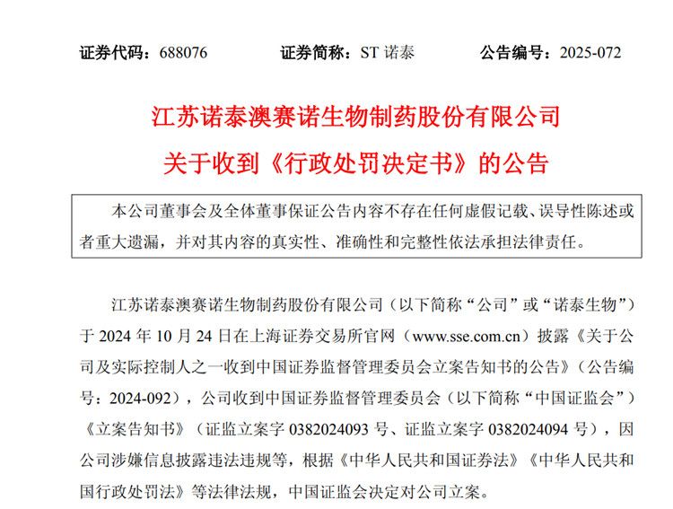 综合相关事项,证监会对江苏诺泰澳赛诺生物制药股份有限公司责令改正,给予警告,并处以4,740 万元罚款;对时任ST 诺泰副董事长、董事赵德中给予警告,并处以 1,300 万元罚款,其中作为直接负责的主管人员处以 500 万元罚款,作为实际控制人组织、指使上述行为处以800 万元罚款;对时任ST 诺泰董事长、董事赵德毅给予警告,并处以 500 万元罚款;对时任ST 诺泰董事兼总经理、副董事长金富强给予警告,并处以 330 万元罚款;对时任ST 诺泰董事长兼总经理童梓权、时任ST 诺泰副总经理谷海涛给予警告,并分别处以 300 万元罚款;对时任ST 诺泰财务总监徐东海给予警告,并处以 150 万元罚款。