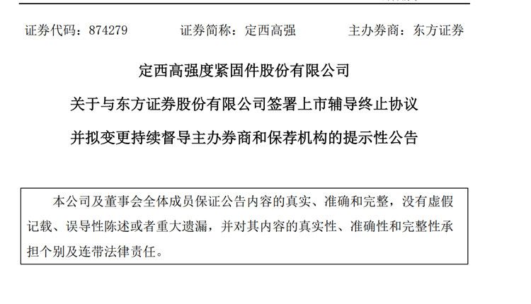 挂牌时,定西高强聘请东方证券(包括其投行子公司东方证券承销保荐有限公司)担任其主办券商及后续持续督导券商。公告显示,2025年1月10日,定西高强与东方证券签署了《关于持续督导及首发上市事项之终止协议》,东方证券不再作为定西高强的IPO辅导机构。同日,定西高强与一创投行签署了附生效条件的持续督导协议。