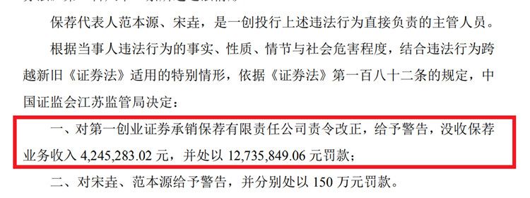 依据相关规定,江苏证监局决定一创投行责令改正,给予警告,没收保荐业务收入 424.53万元,并处以 1273.58万元罚款。