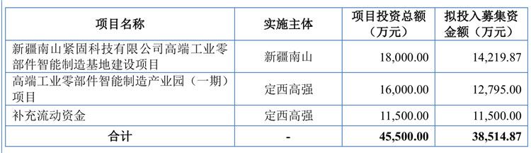 此次,定西高强募集资金约3.85亿元,所募资金投向新疆南山紧固科技有限公司高端工业零部件智能制造基地建设项目、高端工业零部件智能制造产业园(一期)项目及补充流动资金。
