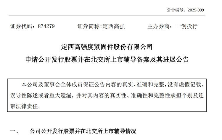 2025 年 2 月 24 日,定西高强聘请一创投行担任公司首发上市辅导机构,并于同日向甘肃证监局报送了上市辅导备案材料。甘肃证监局于 2025 年 2 月 25 日确认了公司辅导备案申请。