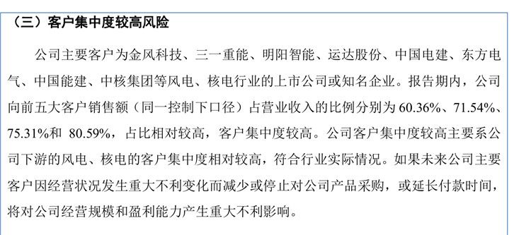 招股书显示,定西高强主要客户为金风科技、三一重能、明阳智能、运达股份、中国电建、东方电气、中国能建、中核集团等风电、核电行业的上市公司或知名企业。报告期内,公司 向前五大客户销售额(同一控制下口径)占营业收入的比例分别为60.36%、71.54%、 75.31%和80.59%,占比相对较高,客户集中度较高。