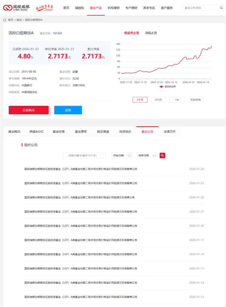 在投资市场的喧嚣中,国投瑞银白银期货证券投资基金(LOF)A 类基金份额(场内简称:国投白银LOF;交易代码:161226)近期以“多次提示风险”与“密集停牌”的姿态闯入公众视野。