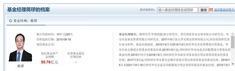 天天基金网显示,蒋璆硕士研究生学历,曾任国泰君安证券有限公司研究员、华宝兴业基金管理有限公司研究员。2011年6月加入华安基金管理有限公司,担任投资研究部行业分析师、基金经理助理。2015年6月至2016年9月担任华安安信消费混合型基金、华安升级主题混合型基金的基金经理,2015年6月起,同时担任华安动态灵活配置混合型基金的基金经理,2015年11月至2018年9月,同时担任华安新乐享保本混合型证券投资基金的基金经理。2017年3月起,同时担任华安睿安定期开放混合型证券投资基金的基金经理。2018年5月至2021年8月16日担任华安安益灵活配置混合型证券投资基金的基金经理。2018年9月至2021年8月16日担任华安新乐享灵活配置混合型证券投资基金的基金经理。2020年6月8日担任华安鼎利混合型证券投资基金基金经理。