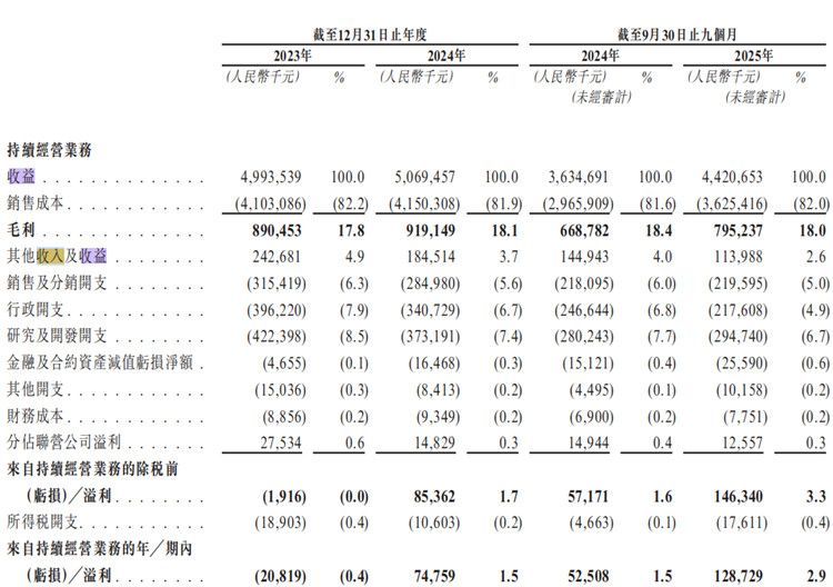 2023年、2024年以及2025年前三季度(以下简称报告期期),卡奥斯实现营收分别为49.94亿元、50.69亿元、44.21亿元;期内净利润分别为-0.21亿元、0.75亿元、1.29亿元。