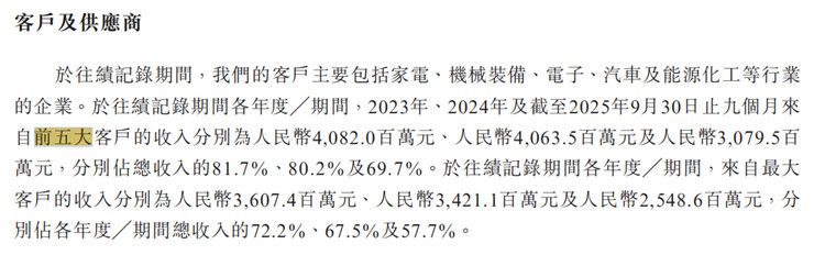 招股书显示,报告期内,卡奥斯对公司前五大客户销售金额占比分别约为81.7%、80.2%、69.7%;媒体报道显示,卡奥斯对其第一大客户海尔集团销售金额分别约为36.07亿元、34.21亿元、25.49亿元;占当期收入比例分别约为72.2%、67.5%、57.7%。