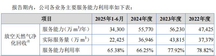 招股书显示,从2022年至2024年以及2025年1-6月,凯龙洁能的放空天然气净化回收业务的服务能力利用率的分别为78.82%、77.92%、66.25%和65.38%。