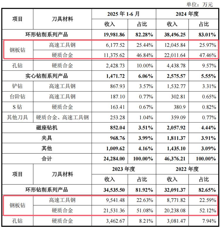 招股书显示,2022年-2024年及2025年上半年(以下简称报告期),欣兴工具的钢板钻产品实现的收入分别为2.9亿元、3.11亿元、3.41亿元及1.76亿元,占公司主营业务收入的比例分别为 74.72%、73.71%、73.44%及72.28%。