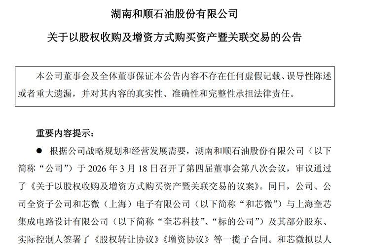 近日,和顺石油发布公告称,根据公司战略规划和经营发展需要,公司于 2026 年 3 月 18 日召开了第四届董事会第八次会议,审议通过了《关于以股权收购及增资方式购买资产暨关联交易的议案》。同日,和顺石油、和顺石油全资子公司和芯微(上海)电子有限公司与上海奎芯集成电路设计有限公司及其部分股东、实际控制人签署了《股权转让协议》《增资协议》等一揽子合同。
