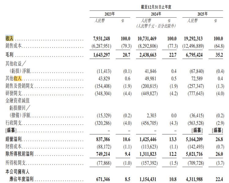 招股书显示,从2023年至2025年,该公司的营业收入分别为79.31亿元、107.31亿元和192.92亿元,归属于上市公司股东的净利润分别为6.71亿元、11.54亿元、43.12亿元。