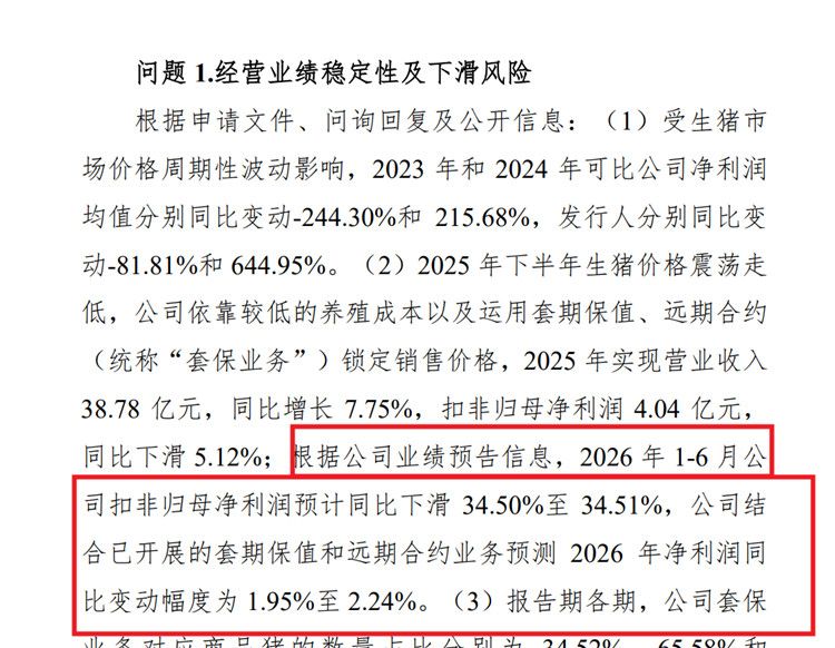 二轮问询显示,根据石羊农科业绩预告信息,2026 年 1-6 月公司扣非归母净利润预计同比下滑34.50%至 34.51%,公司结合已开展的套期保值和远期合约业务预测 2026 年净利润同比变动幅度为 1.95%至 2.24%。
