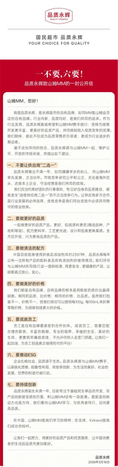 3月16日,澎湃新闻记者获悉,永辉超市自有品牌“品质永辉”发布致山姆MM的一封公开信,提出“一不要,六要”。