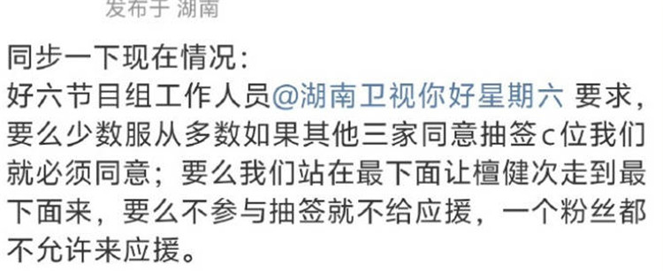 4月14日晚《你好,星期六》官博发布安全倡议书,呼吁观众朋友们遵守公共场所秩序、杜绝违规应援与聚集行为、维护健康网络环境、明确法律责任、警惕票务诈骗,疑似回应疑似回应檀健次粉丝维权。