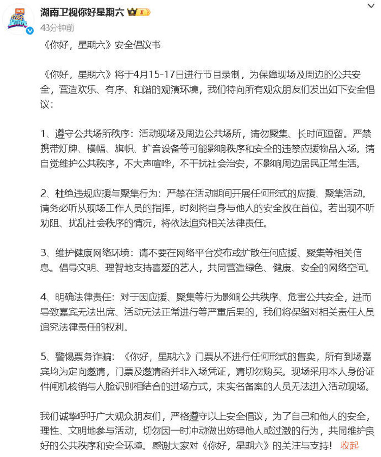 我们诚挚呼吁广大观众朋友们,严格遵守以上安全倡议,为了自己和他人的安全,理性、文明地参与活动,切勿因一时冲动做出妨碍他人或过激的行为,共同维护良好的公共秩序和安全环境。感谢大家对《你好,星期六》的关注与支持!