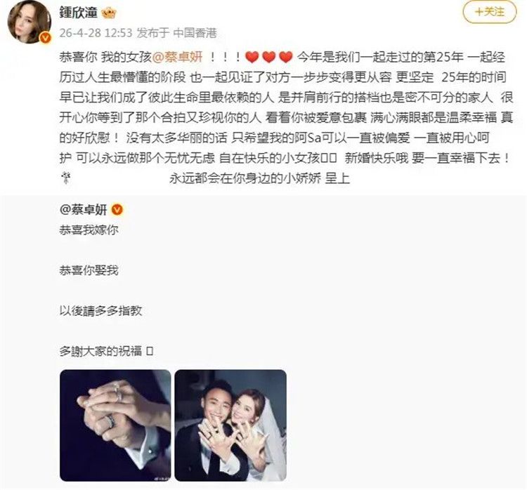 4月28日,蔡卓妍在社交平台发文官宣结婚:“恭喜我嫁你,恭喜你娶我,以后请多多指教,多多谢大家的祝福。” 随后,圈内好友们纷纷送上祝福。