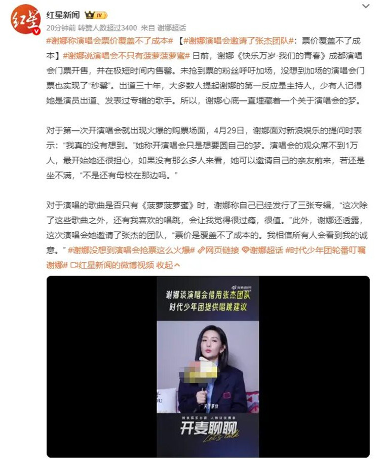 对于演唱的歌曲是否只有《菠萝菠萝蜜》时,谢娜称自己已经发行了三张专辑,“这次除了这些歌曲之外,还有我喜欢的唱跳,会让我觉得很过瘾,很值。”此外,谢娜还透露,这次演唱会她邀请了张杰的团队,“票价是覆盖不了成本的。我相信所有人会看到我的诚意。”