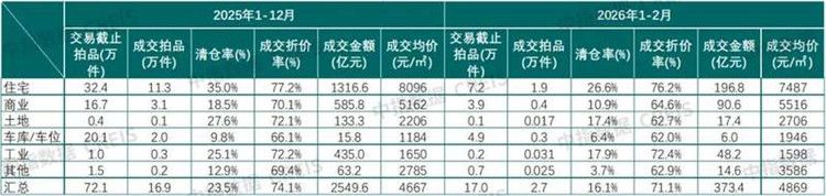 数据显示,1-2月全国法拍房累计挂拍17万套,同比微降2.3%;成交2.7万套,同比减少4.7%;总成交金额373.4亿元,同比降幅达16.5%;成交均价为4869元/平方米,同比下跌8.1%;平均折价率(成交价/评估价)为71.1%,市场整体清仓率仅为16.1%。受春节假期影响,2月市场清仓率跌至12.6%。